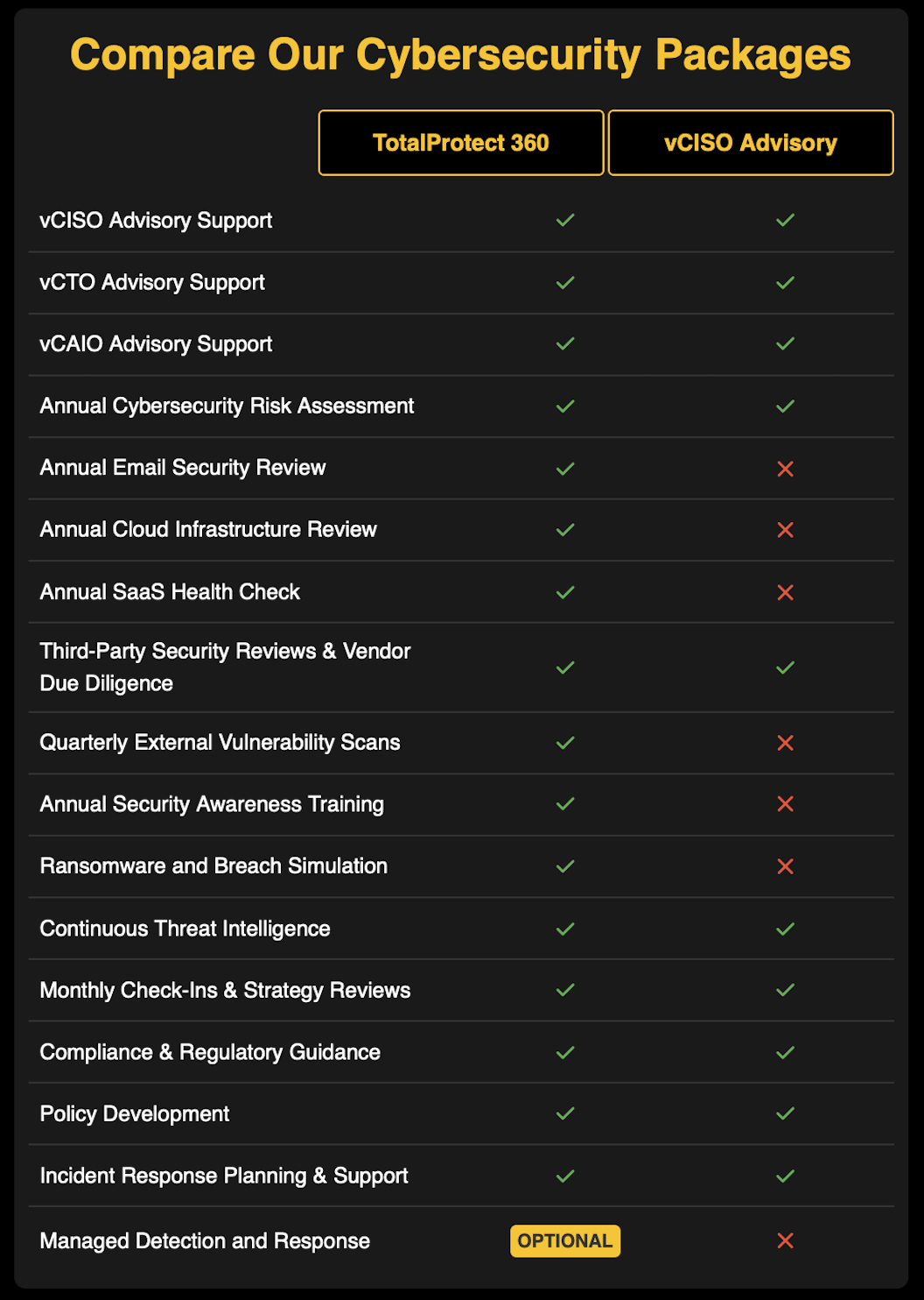 ✔ Dedicated Security Leadership—Gain direct access to a trusted advisor providing cybersecurity strategy & guidance.